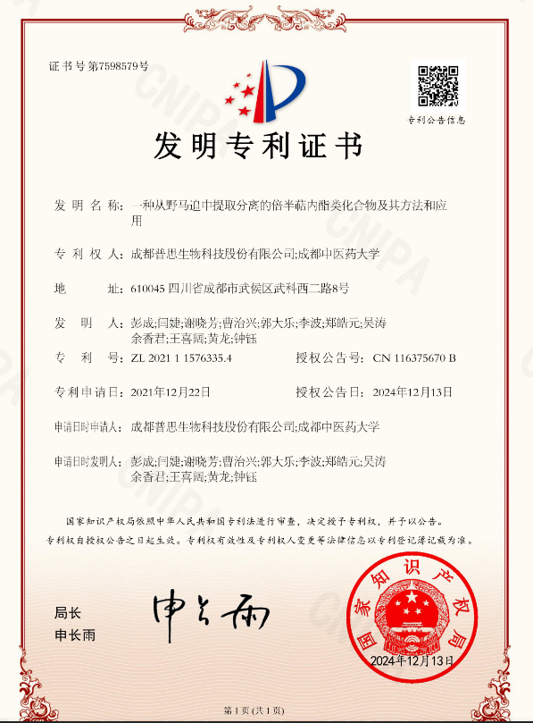 2019年 普思作為主要完成單位之一申報的“基于構效關系的中藥活性物質發現及其開發應用”項目,榮獲四川省科學技術廳科技進步一等獎。